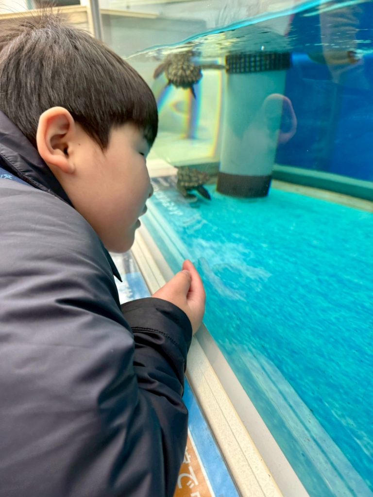 小さなウミガメをじーっと観察。間近で見る姿に興味津々です。