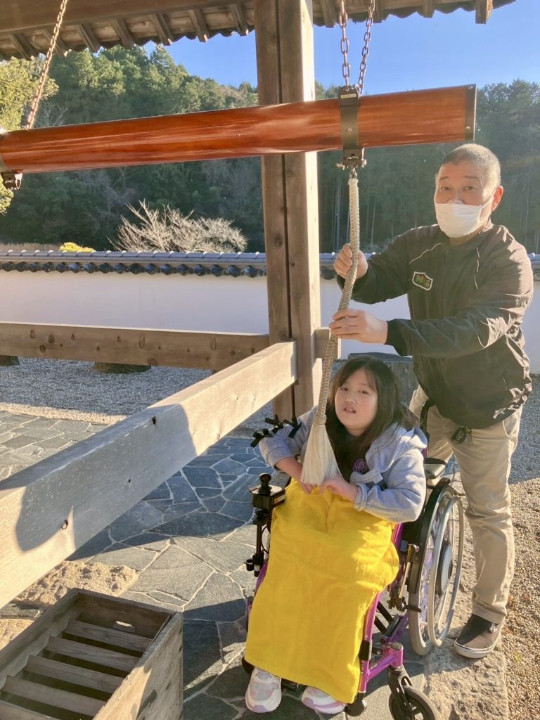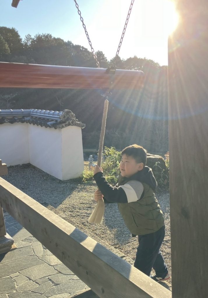 スタッフさんと一緒に、しっかりと鐘の紐を握ってお参りです。