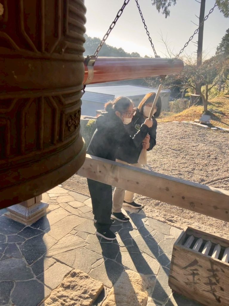 特に盛り上がったのは、大きな鐘を突く体験です。 一人ひとりが自分の力で、あるいはスタッフと協力しながら、力強く紐を引きました。響き渡るゴーンという音に、子どもたちは驚いたり、嬉しそうに笑ったりと、様々な表情を見せてくれました。