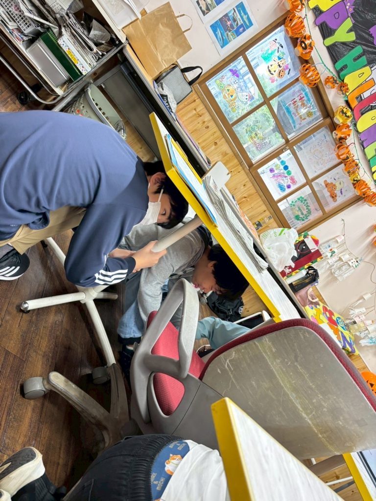 訓練が始まると、みんな真剣な表情に変わりました。まずは、机の下に潜り込み、頭を守ります。スタッフも一緒に、子どもたちが安心できるように声かけをしました。