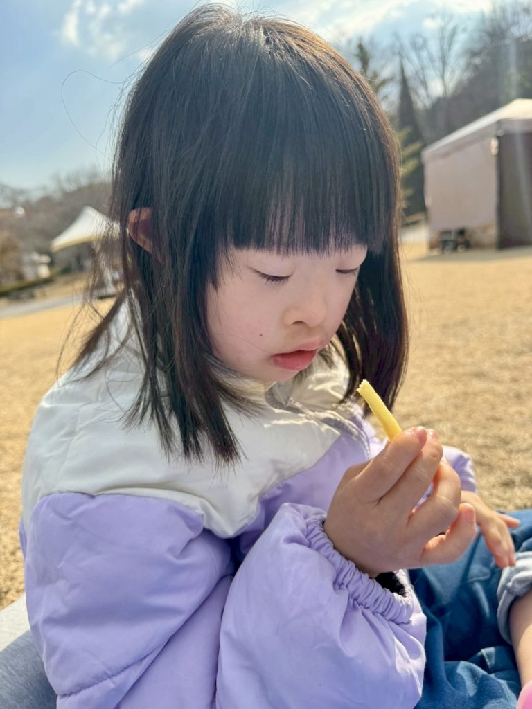 外で食べるおやつは美味しいね!みんなで仲良く味わいました。