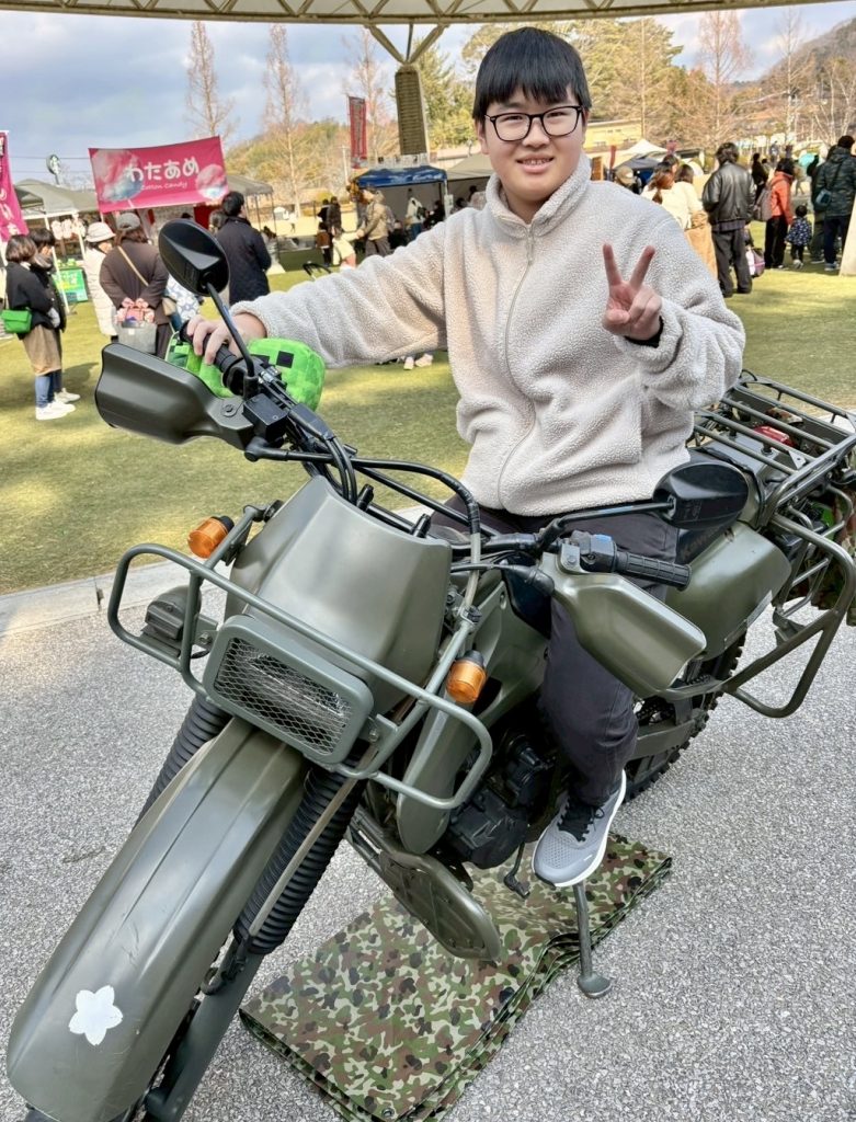 会場はたくさんの人で賑わっており、キッチンカーや楽しいマルシェなど、魅力的なブースがいっぱいです。子どもたちは、普段なかなか見ることのできない自衛隊の大きなバイクに跨らせてもらったり、青空の下でおやつを食べたりと、思い思いの時間を過ごしました。