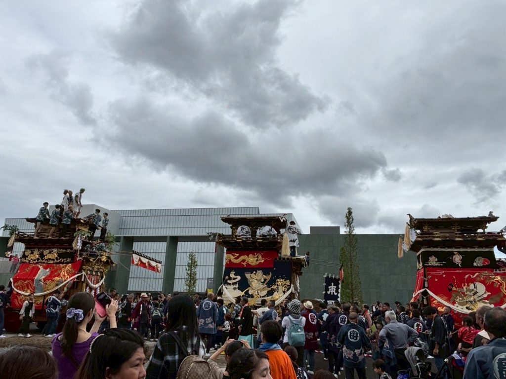 美術館を背景に並ぶ山車3機の姿はまさに圧巻でした。