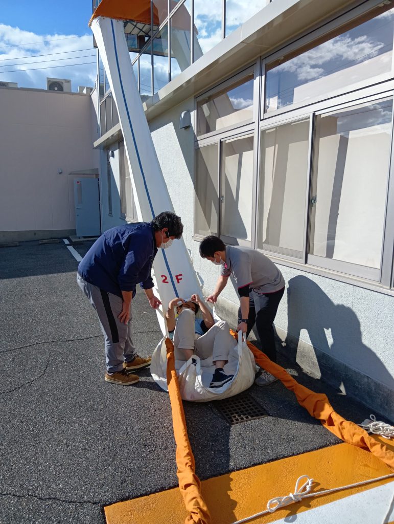 🚨 そして、いざ実践へ!スタッフが**避難袋(滑り台)**を使って2階から脱出するデモンストレーションをしました。