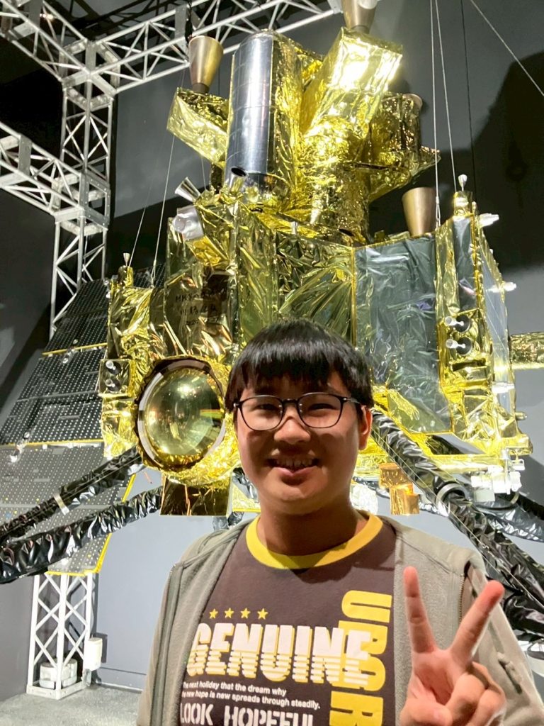 金色の探査機模型の前でピース!