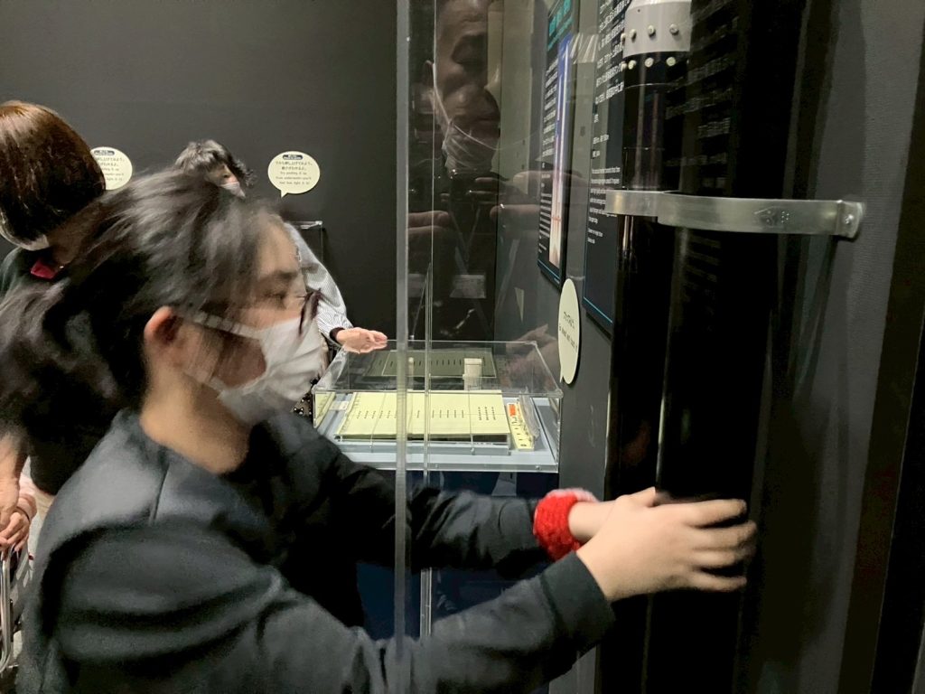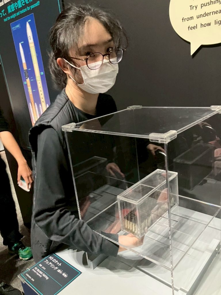 展示の中には、実際に触れて体験できるコーナーもたくさんありました。H3ロケットの先端部分(フェアリング)の模型や、探査機の部品に触れて「重さや感触を確かめてみよう」という展示では、みんな熱心に手を伸ばしていました。
