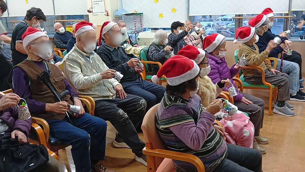 スタッフが手作りのサンタ靴にお菓子を詰めてあげると、会場中が優しい笑顔に。小さなサンタさんたちとの交流に、おじいちゃんもおばあちゃんも目が細まりっぱなしでした。