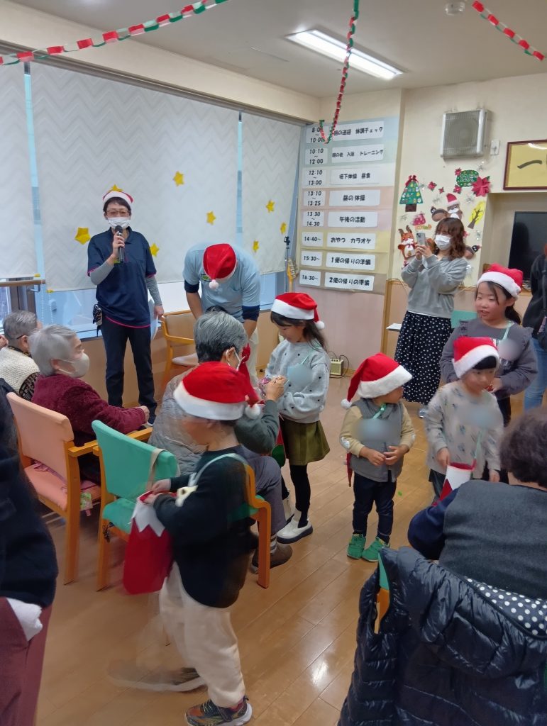 スタッフが手作りのサンタ靴にお菓子を詰めてあげると、会場中が優しい笑顔に。小さなサンタさんたちとの交流に、おじいちゃんもおばあちゃんも目が細まりっぱなしでした。