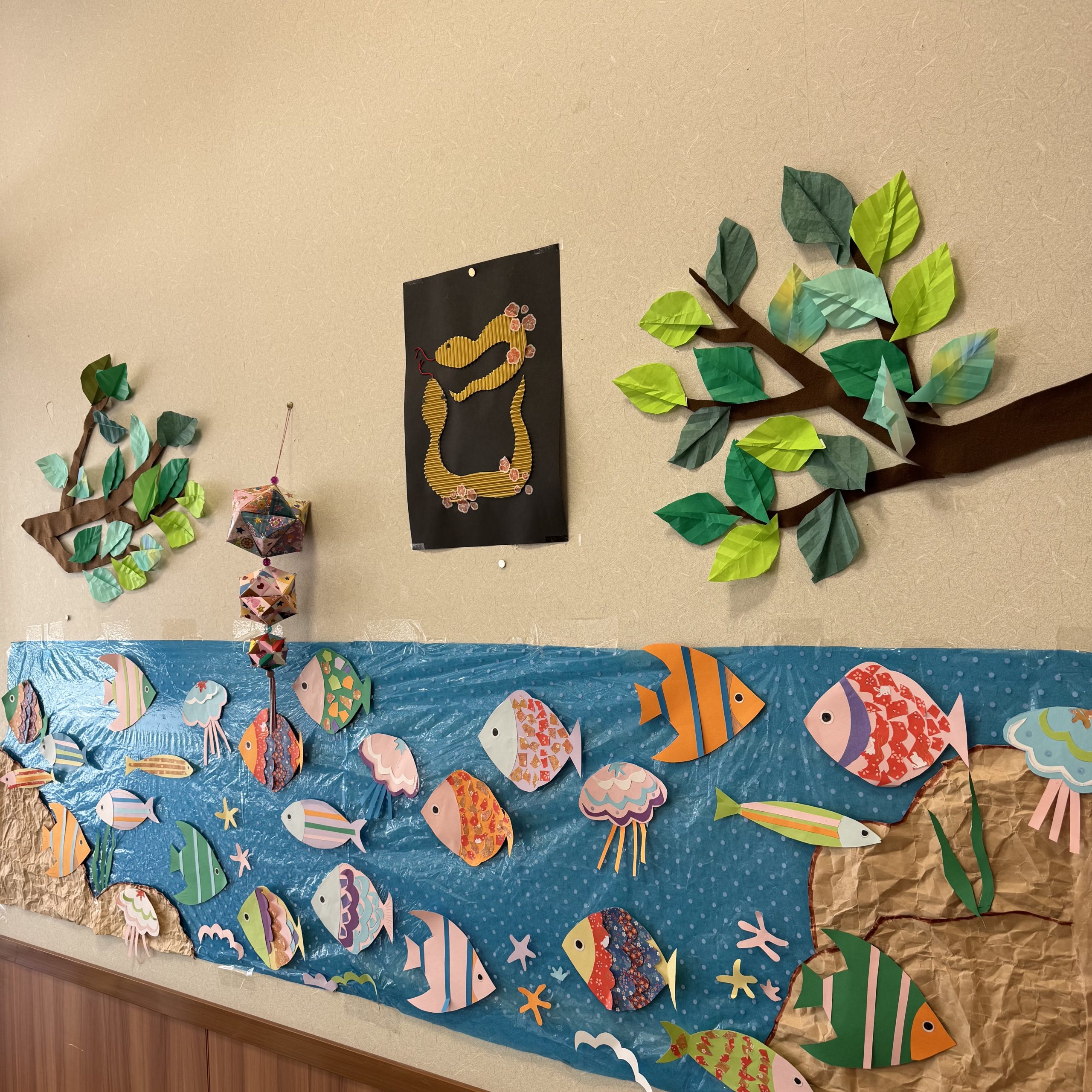 清流 作者: スタッフ 利用者様 本人の工夫したこと・感想 ~魚のうろこ~ 手先が動かしにくい方に、紙をちぎってもらうなど、皆で参加できるように作品を作る事を心掛けました。 ~岩のしわ~ こちらも、うまく手が動かせない方に手伝って頂きました。 海かな、川かな、素敵かな。 (責任者)