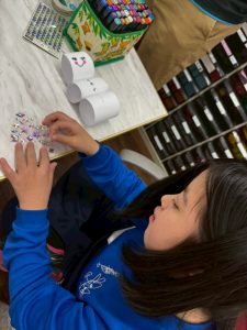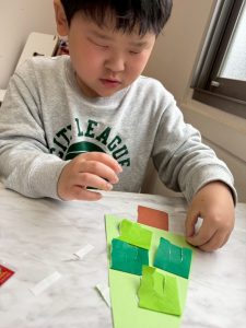 クリスマスツリーは折り紙を千切って画用紙に貼付け、色とりどりの飾りを付けていきました。今回は香り袋を付けてみました。