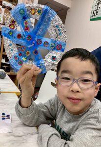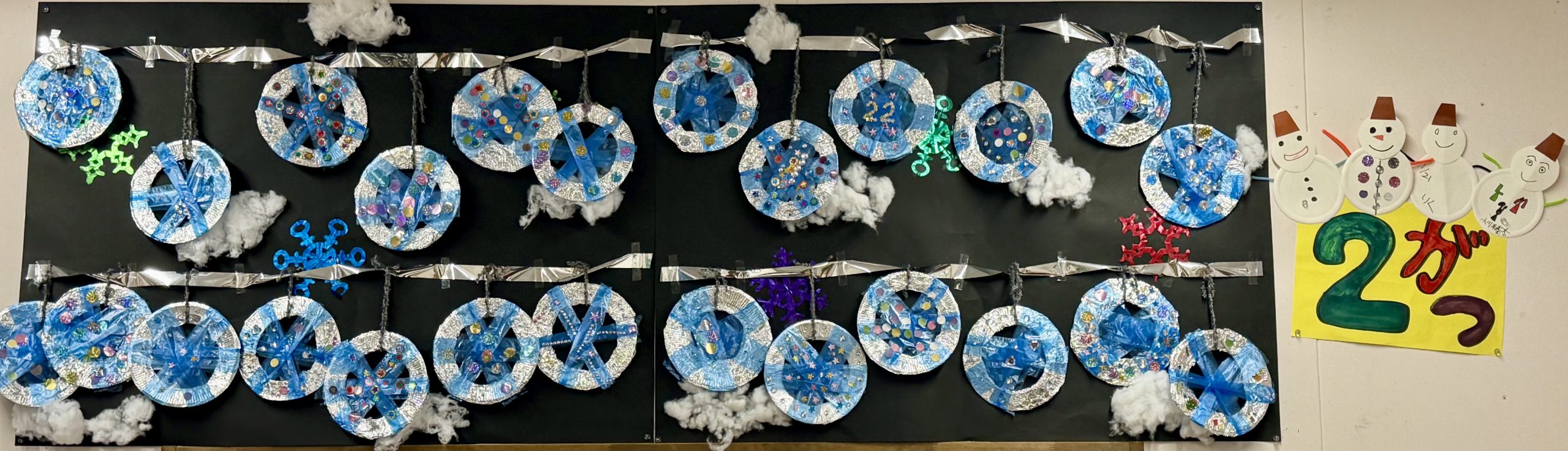 2月の壁面制作は、紙皿とアルミホイルで雪の結晶を作りました!