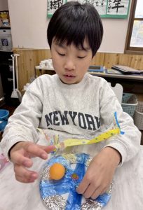 アルミホイルの銀色と、ブルーのテープが光を反射して、活動部屋がパッと明るくなりました。