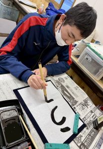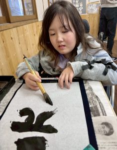新しい年を迎え、みんなで「書初め」に挑戦しました! 子供たちは筆を持つと表情は真剣そのもの。