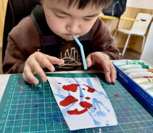 画用紙にポタリと落とした絵の具に向かって、思いきり「ふぅ〜〜っ!」と息を吹き込む子どもたち。絵の具が予想外の方向にスルスルと伸びていく様子に、一生懸命息を吹きかけていました。