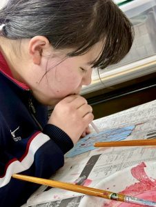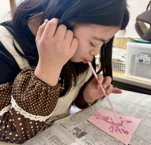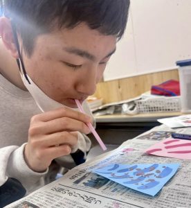 3月の制作活動では、日本の伝統行事である「桃の節句」にちなみ、お雛様作りを行いました。今回挑戦したのは、ストローを使って絵の具を動かす「吹き絵(ブローイング)」という技法です。