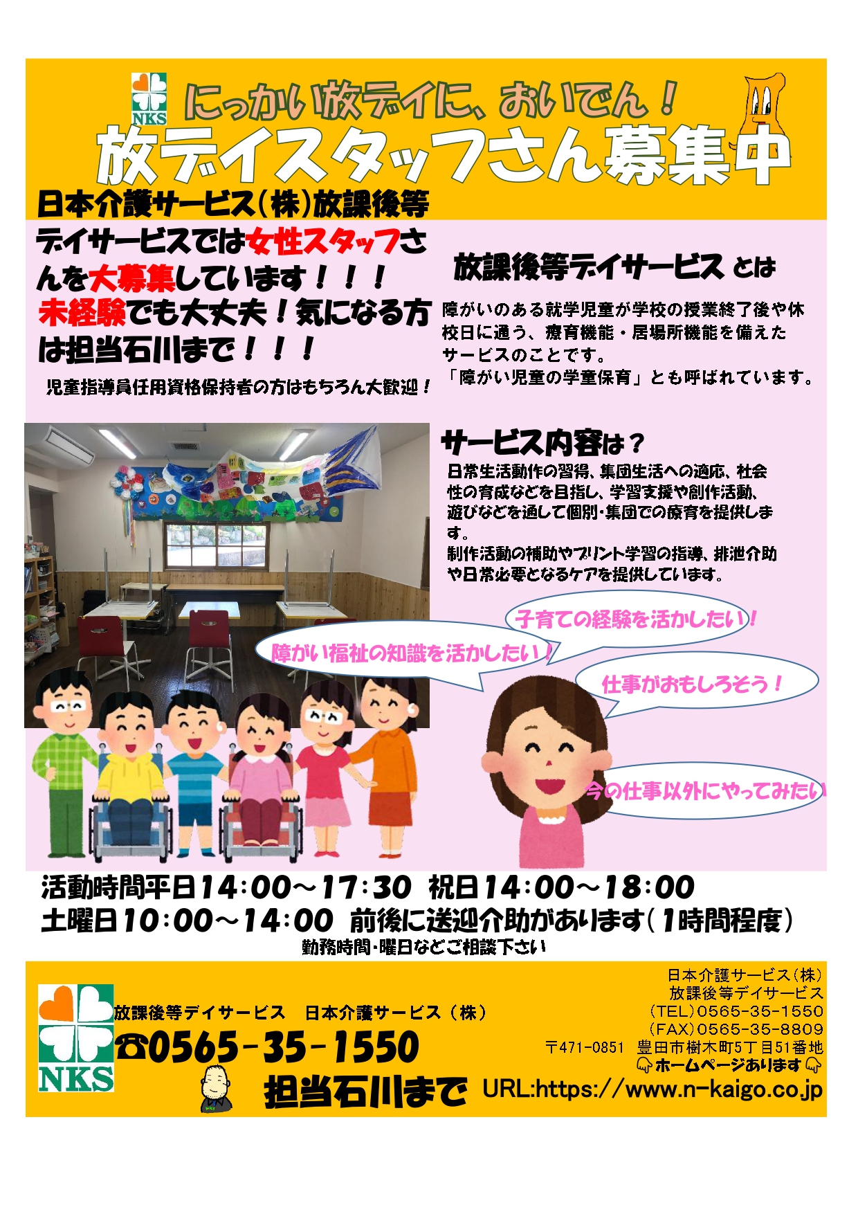 日頃より、日本介護サービス(にっかい)のホームページをご覧いただきありがとうございます。 現在、弊社の放課後等デイサービスでは、障がいのある子どもたちの成長をサポートするスタッフを募集しています。